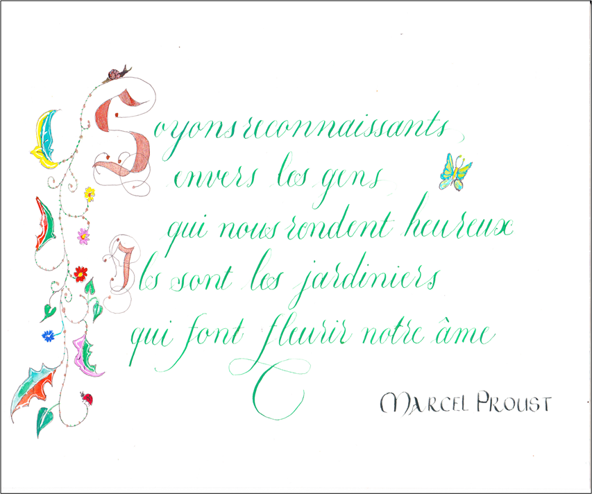 La calligraphie est l’art de la belle écriture. Elle se pratique avec des plumes de taille différente et des porte-plumes, mais on peut la pratiquer aussi avec des pinceaux et toutes sortes d’outils plus modernes puisque les calligraphes ont crée des calligraphies contemporaines. La calligraphie améliore la concentration, l’attention, l’observation. Elle agit un peu comme une sorte de méditation. Elle permet de faire de belles lettres avec les pleins et les déliés et on peut l’utiliser pour écrire des faire-part, des cartes d’invitation, des menus, etc..